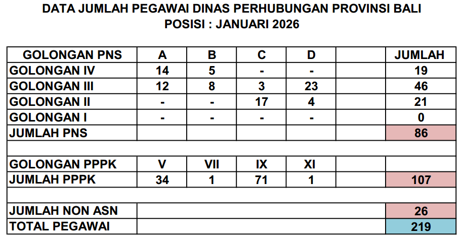 Jumlah pegawai di Lingkungan Dinas Perhubungan Provinsi Bali posisi Januari Tahun 2026 sebanyak 219 orang, terdiri dari :
